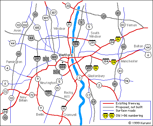 eventually meet I-84 near Tolland. Some plans also called for extending 20 westward